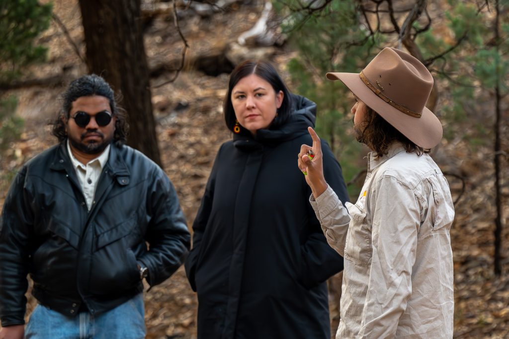 Alice (middle) engaging with Sri Lankan scholar Sreen Boralessa (left) and Adnyamathanha guide Izzy (right) during the study tour to the Ikara–Flinders Ranges National Park in South Australia.